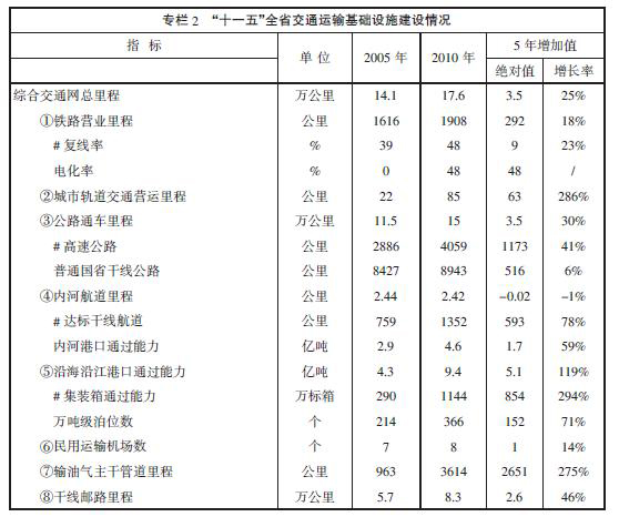 “十一五”是我省交通史上投資規模最大、發展速度最快的時期,在基礎設施總量規模、運輸能力供給和服務質量提升等方面取得了顯著成就,為經濟社會平穩較快發展提供了重要的支撐和保障。交通運輸業進入各種方式協調發展、能力擴大與效率提高并重、全面建設現代綜合交通運輸體系的新階段。