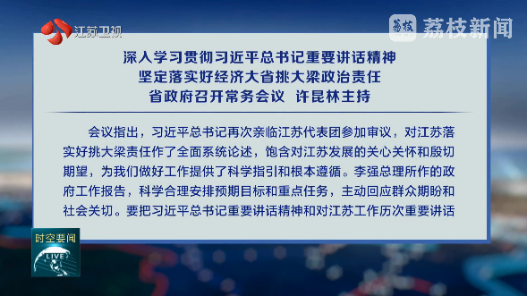 3月13日,省政府召開常務會議,認真學習習近平總書記參加十四屆全國人大三次會議江蘇代表團審議時的重要講話精神和全國兩會精神,落實國務院政府工作報告部署,研究安排重點工作。